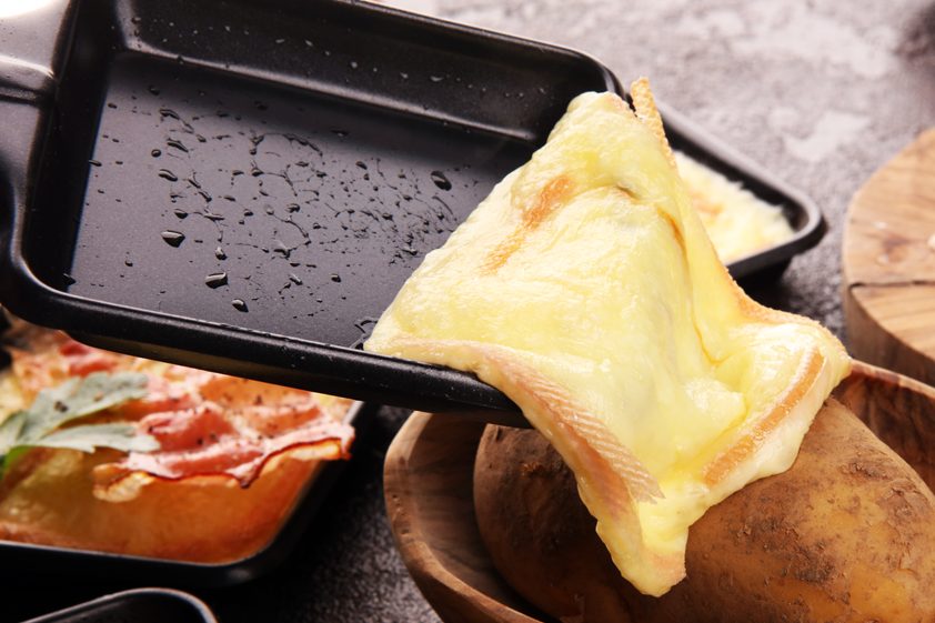 Nun diese Mischung in die Raclette-Pfännchen verteilen. Mit jeweils einer guten Scheibe Raclettekäse belegen und gratinieren.