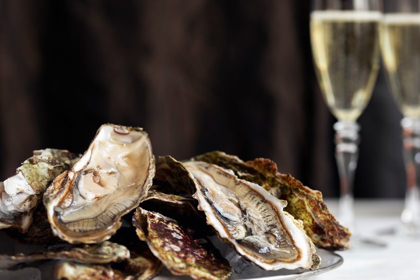 Nun die Austern auf die runde Seite legen, mithilfe eines Austernmessers am Scharnier öffnen und die oberen flachen Deckel abnehmen. Dann den Muskel wiederum mithilfe des Austernmessers von der Schale lösen.
