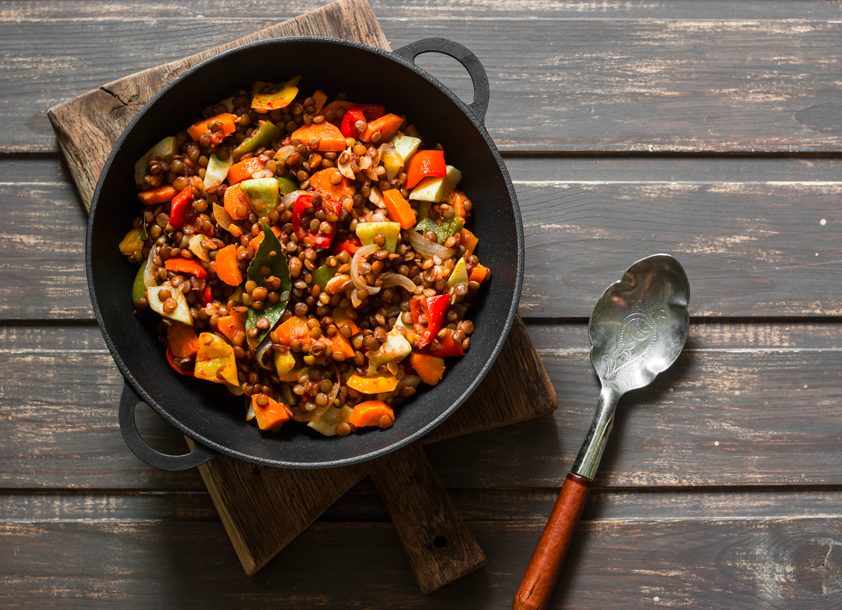 Berglinsen in einem Sieb abtropfen lassen und zu dem Gemüse in den Topf geben. Würzen Sie mit etwas Salz und Pfeffer und löschen Sie alles mit hellem Balsamessig ab. Geben Sie das Tomatenmark hinzu und lassen Sie alles für ca. 2 Minuten anrösten. Jetzt den Traubensaft und die Brühe hinzufügen, so dass die Berglinsen leicht mit Flüssigkeit bedeckt sind und geben Sie die Lorbeerblätter hinzu. Die Linsen leicht köchelnd garen ( etwa 35 bis 40 Minuten ) und gegebenenfalls mit etwas Brühe aufgießen.