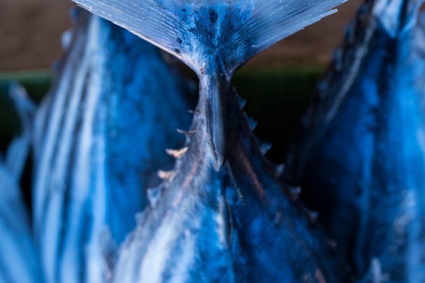 Falls der Blauflossen Thunfisch noch Sehnen enthält, schneiden Sie diese großzügig heraus. Wickeln Sie den Thunfisch dann möglichst eng in Frischhaltefolie ein und lassen ihn im Tiefkühlfach leicht anfrieren, dann lässt er sich besser in Form bringen und in Scheiben schneiden. Das angetaute Thunfischstück schneiden Sie dann mit einem scharfen Messer in ca. 3 mm dünne Scheiben.
