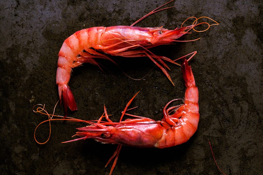 Die Garnelen im unteren Drittel des Rückens einschneiden und den Darm der Tiere mit einer Messerspitze oder Fleischgabel vorsichtig herausziehen. Die ersten Glieder des Panzers samt den Beinen entfernen. Den Schwanz und die letzten zwei Glieder des Panzers stehen lassen, alle Garnelen abspülen und gut trocken tupfen.