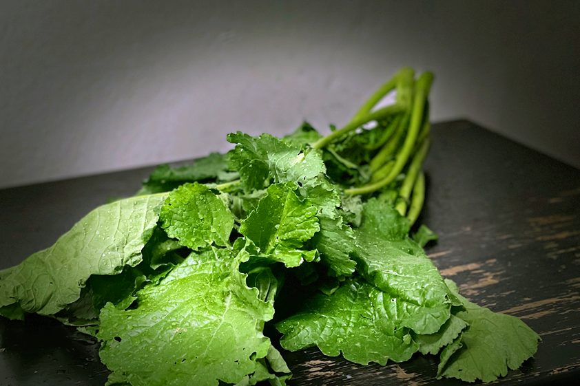 Nun die Temperatur der ersten Pfanne mit den Gnocchis etwas erhöhen, Cima di rapa in die Pfanne geben, ab und zu schwenken und gut durcherhitzen. Leicht salzen und pfeffern.