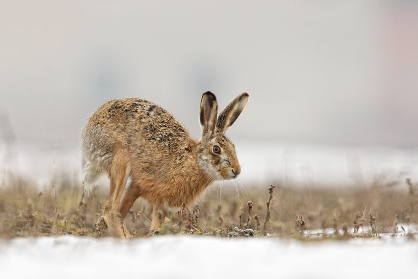 Das Fleisch ordentlich mit einem Küchenpapier abtupfen. Das Schweineschmalz in einem Bräter erhitzen und den Hasen von allen Seiten kurz darin anbraten und wieder herausnehmen.