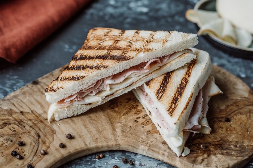 Die Tramezziono-Scheiben mit etwas Olivenöl beträufeln und in einer Grillpfanne von beiden Seiten kurz anrösten. Mit der Mayonnaise bestreichen und dem Romanasalat belegen. Das Filet in Scheiben schneiden und auf den Salat legen. Dann mit dem Tomaten-Relish bestreichen und mit einer Tramezzino-Scheibe abschließen. Den Sandwich-Turm etwas zusammendrücken und diagonal in zwei Dreiecke schneiden.
