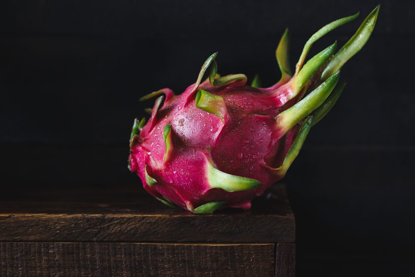 Die Pitahaya schälen und vierteln, die Viertel in nicht allzu feine Scheiben schneiden und neben den Bananen anordnen, sodass eine Oberfläche aus dreierlei optischen Komponenten entsteht.