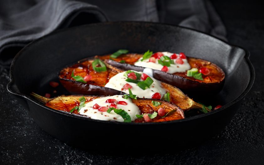 Nehmen Sie die fertig gebackenen Auberginen aus dem Ofen, Legen Sie mit der Haut Seite nach unten auf einen Teller und reichen Sie den Joghurt-Minze Dip dazu.