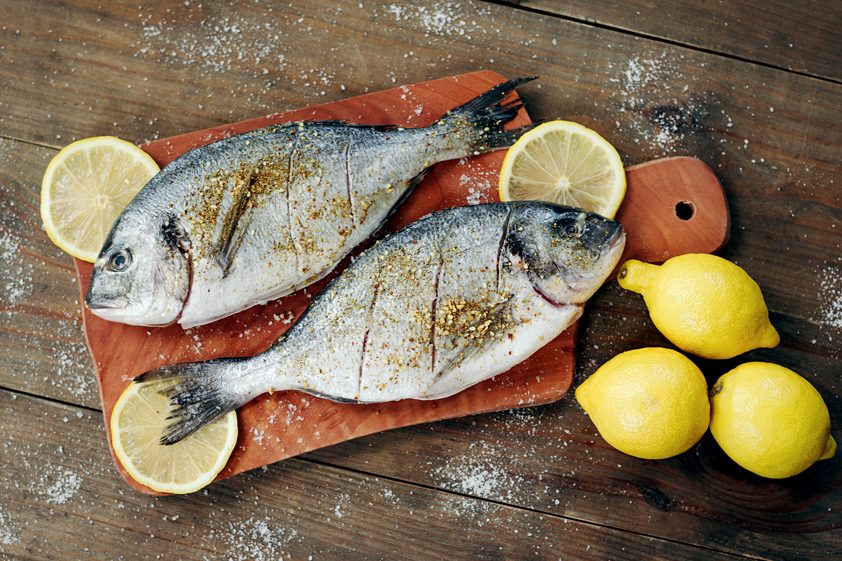 Jetzt Olivenöl in eine ofenfeste Form gießen, in der beide Fische ausreichend Platz haben. Den Boden der Form mit den Kartoffelscheiben auslegen und mit Salz und Thymian bestreuen. Die Fische leicht mit Olivenöl und Meersalz einreiben, auf das Kartoffelbett legen und etwa 12 Minuten im Backofen backen.