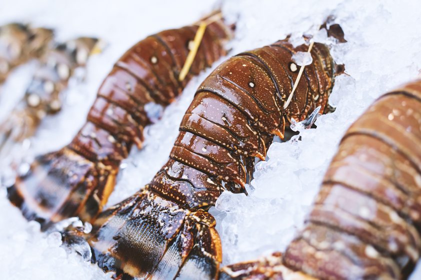 Die Langusten mithilfe einer Küchenschere und einem scharfen Messer längs halbieren und trocken tupfen.