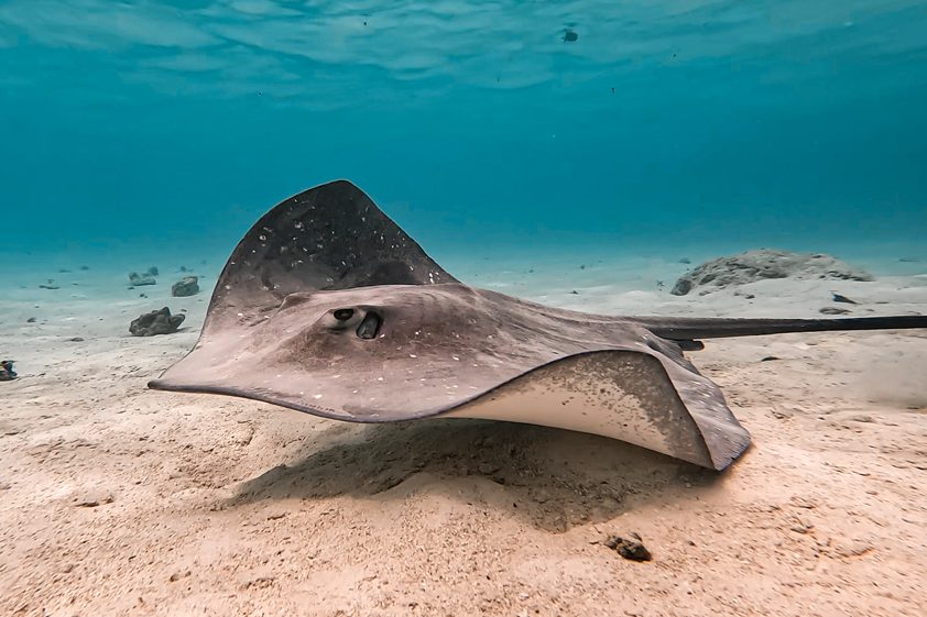 Den Rochenflügel trocken tupfen und von beiden Seiten salzen. Eine beschichtete Pfanne auf höchster Stufe vorheizen, den Pfannenboden mit dem Öl leicht bedecken und die Rochenflügel vorsichtig mit der dickeren Seite einlegen. Die Hitze der Pfanne auf etwa 2/3 zurückschalten, sodass der Fisch schön langsam, aber stetig brät. Nach etwa 4 bis 5 Minuten den Rochen umdrehen und nochmals ca. 3 Minuten braten. Es sollte von beiden Seiten eine schöne leicht goldene Bräune entstehen. Den Fisch heraus-nehmen und auf Küchenkrepp etwas abtropfen. Mit Pfeffer aus der Mühle würzen und mit der Zitronenbutter großzügig übergießen.