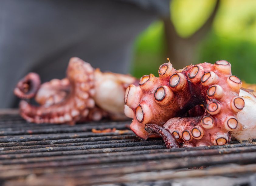 Grillen Sie den Pulpo mit direkter Hitze von allen Seiten gut an und lassen ihn dann bei indirekter Hitze ziehen, bis er komplett durchgewärmt ist.