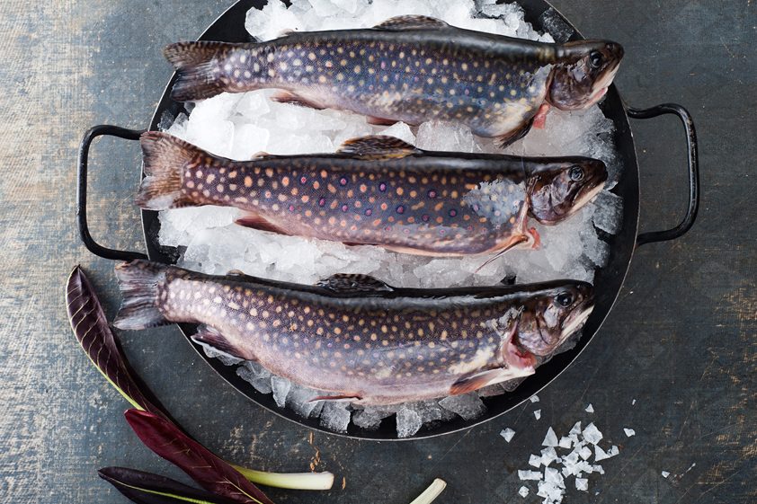 Nun die Saiblinge aus dem Ofen nehmen und auf entsprechenden Teller anrichten. Die Butter in separaten Saucieren auf den Tisch stellen und je nach Bedarf an die Fische gießen.