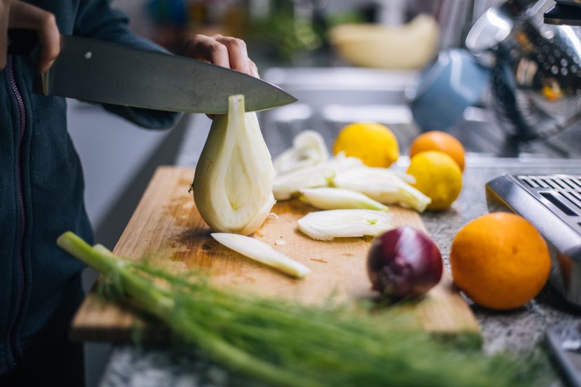 Die Fenchelknollen säubern, der Länge nach achteln und den Strunk entfernen. Das Fenchelgrün für später aufheben und zur Seite stellen.