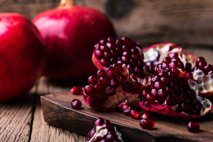 Jetzt den Granatapfel waschen und auf einer Arbeitsfläche etwas drücken und rollen, so wird das Innere bereits etwas mürbe und die Kerne lösen sich besser aus der Frucht.