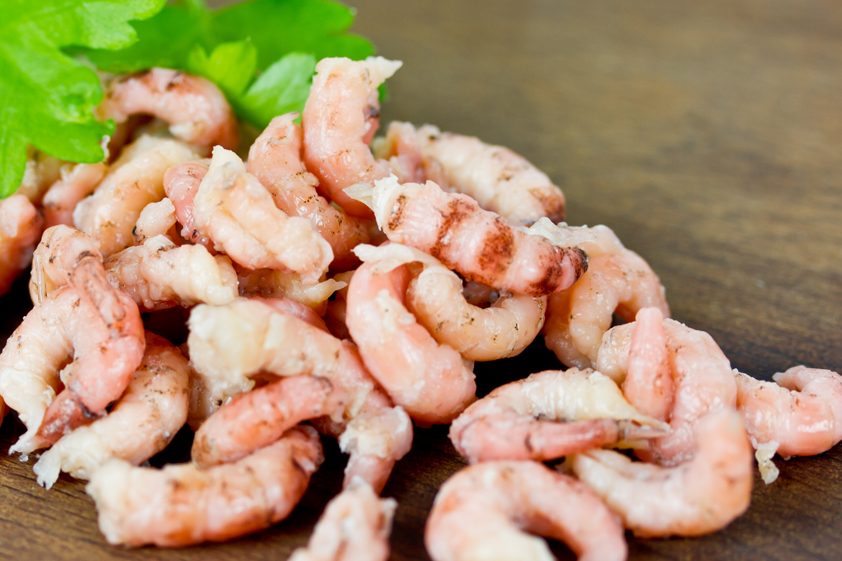 Parallel eine weitere Pfanne auf den Herd stellen, die restliche Butter hinzugeben und ebenso aufschäumen lassen. Darin sanft die Krabben erwärmen, sie sollen nicht rösten oder zu viel Hitze erhalten. Mit einem Spritzer Zitrone, geschnittener Petersilie und Pfeffer abschmecken.