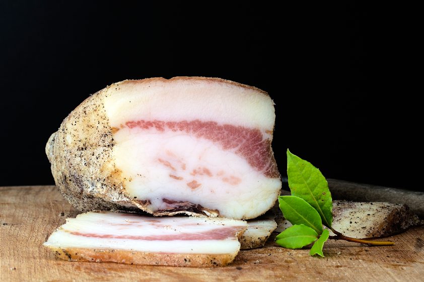 Dann den Speck in 2 mm dünne und 2 cm breite Quadrate schneiden. Ein Backblech mit Backpapier auslegen, die Speckscheiben darauf verteilen, ein Backpapier oben auflegen und mit einem weiteren Backblech beschweren und für ca. 8 Minuten in den Backofen geben.