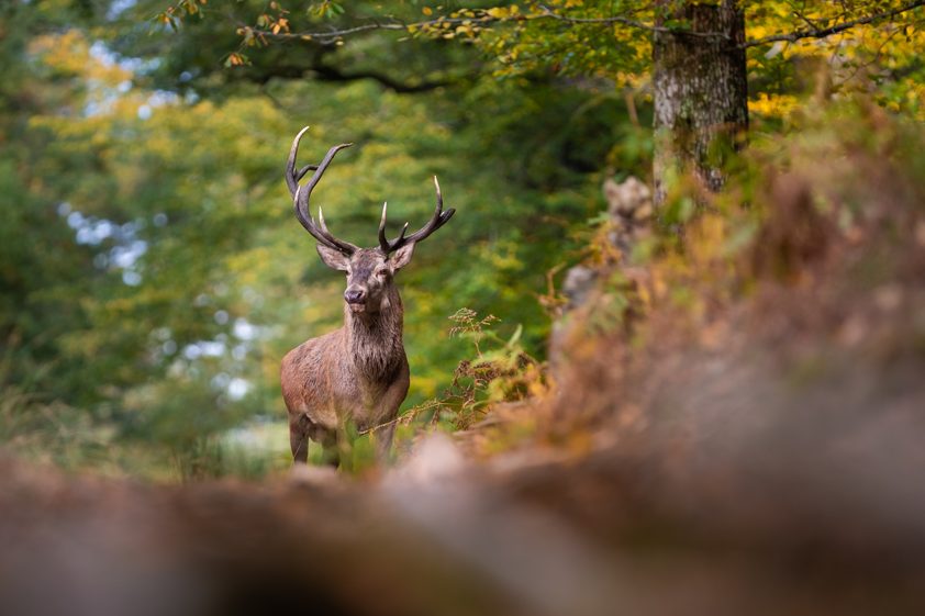 Jetzt die Hirschkeule in einem Bräter kurz von allen Seiten anbraten und herausnehmen. Den Bräter erneut erhitzen und das geschnittene Gemüse darin rösten. Das Tomatenmark hinzu-fügen, kurz mitrösten und mit einem Drittel des Rotweins ablöschen. Dann alles einkochen lassen, ein weiteres Mal mit Rotwein ablöschen und wiederum einkochen lassen. Das letzte Drittel des Weines hinzufügen, einkochen und mit einem Glas Wildfond und der Gemüsebrühe aufgießen.