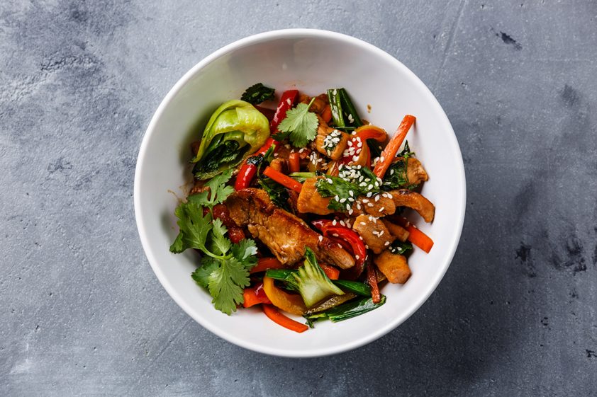 Nehmen Sie das gegarte Fleisch aus dem Wok und lassen es in einem Sieb abtropfen. Wischen Sie den Wok mit etwas Küchenpapier aus und erhitzen ihn wieder. Geben Sie 1 EL Erdnussöl hinein. Wenn das Öl wieder anfängt zu rauchen, geben Sie den Knoblauch hinzu und rösten ihn darin kurz an bevor Sie die Paprikawürfel und die Frühlingszwiebeln dazugeben. Braten Sie alles für etwa 1 Minute an und geben dann das gegarte Hähnchenfleisch zurück in den Wok. Alles für weitere 2 Minuten garen lassen.