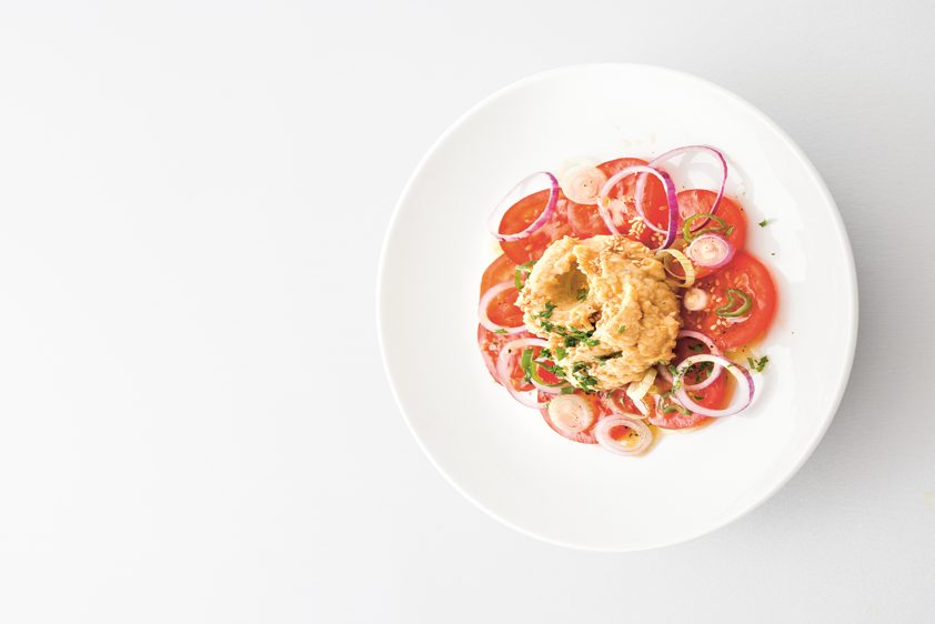 Sesam in einer Pfanne ohne Fett goldbraun rösten, die Petersilie hacken. Hummus mit Petersilie und Sesam bestreuen, nach Belieben mit Olivenöl beträufeln und pfeffern. Zum Tomatensalat servieren. Dazu passt Fladenbrot.