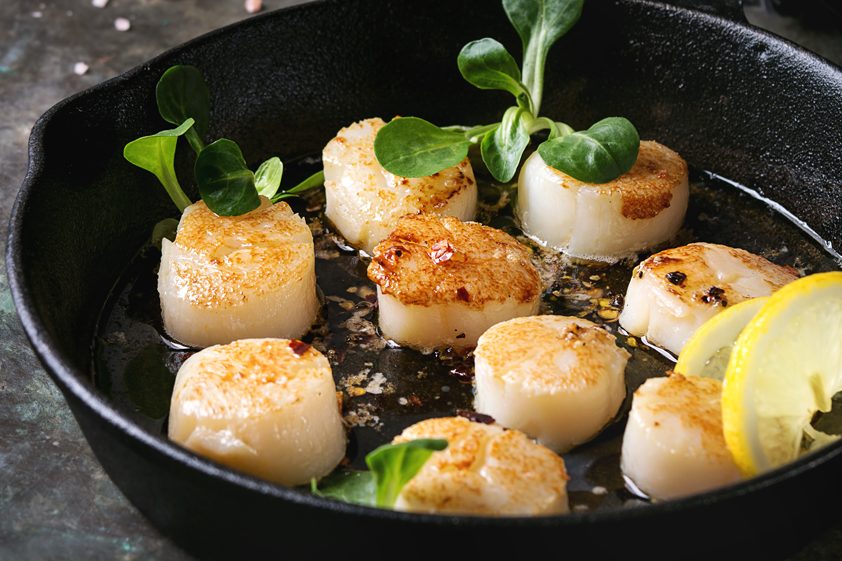Eine Pfanne auf dem Herd erhitzen und die Jakobsmuscheln bei mittlerer Temperatur ca. 1 Minute von beiden Seiten braten, sodass ein goldgelber knuspriger Rand entsteht, leicht salzen.