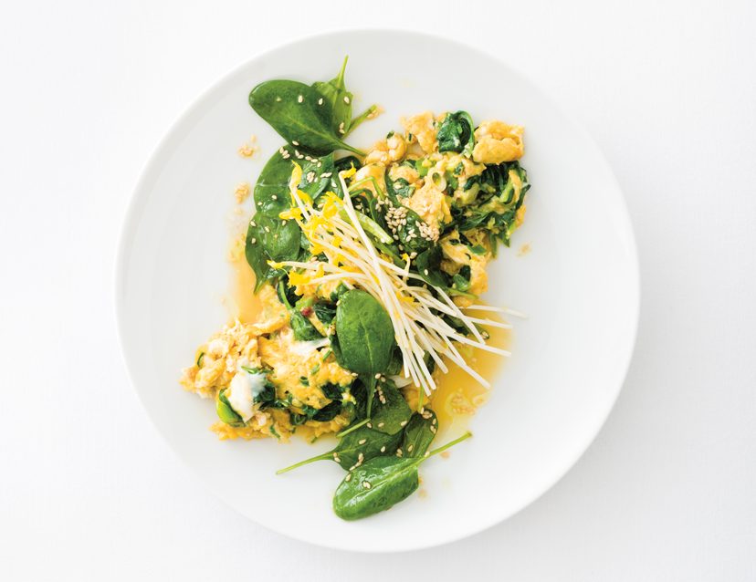 Eier mit 1 Esslöffel süßer Sojasauce und Chilipaste glattrühren und mit Salz würzen. Frühlingszwiebeln in feine Scheiben schneiden. Butter in einer Pfanne schmelzen. Die Hälfte des Spinats mit den Frühlingszwiebeln darin andünsten, bis der Spinat zusammengefallen ist. Eimasse zugeben und in ca.1 Minute zu Rührei braten.