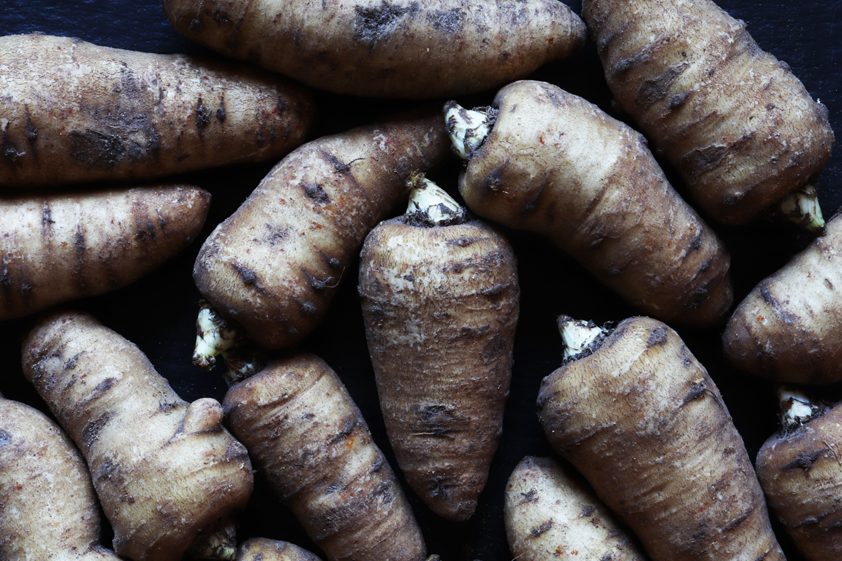 Die Kerbelknollen schälen, schneiden und in Butter andünsten. Mit Gemüsefond und den Gewürzen ablöschen, einkochen und ein ¾ der Sahne dazu gießen. Nach ca. 15 Minuten ist die Knolle weichgekocht. Nun mit einem Stabmixer fein pürieren und dabei den Rest der Sahne angießen. Es sollte eine weichere Konsistenz als Kartoffelpüree entstanden sein.