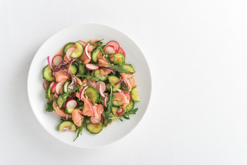 Radieschen waschen und in dünne Scheiben schneiden. Rote Zwiebel in Spalten schneiden. Die Gurkenscheiben trocken ausdrücken. Alle Zutaten mit Rauke und Lachs zu einem Salat vermengen. Mit Salz würzen und servieren.