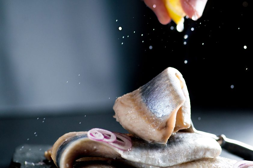 Nun den Matjes und den Kartoffelsalat anrichten und etwas Petersilie darüberstreuen.