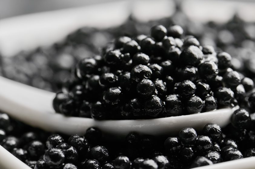 Zuletzt den Kaviar darauf anrichten, gemeinsam mit je einer Tomatenscheibe aus den Cherrytomaten und einem Blatt des Korianders servieren.