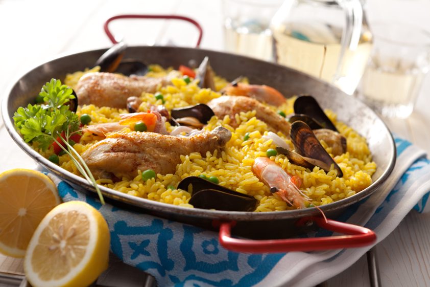Nun die Erbsen unterrühren und die Garnelen sowie Muscheln vorsichtig dazugeben. Heben Sie auch das Hühnchen darunter und erhitzen die Paella noch einmal. Mit Salz und Pfeffer abschmecken. Servieren Sie die Paella in der Pfanne und garnieren diese mit Petersilie und Zitronenspalten.