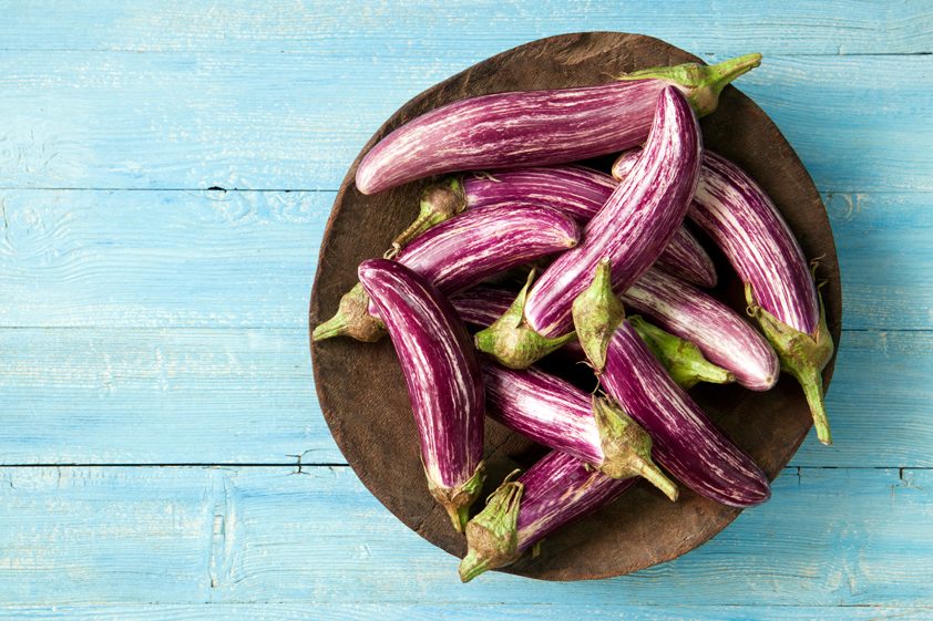 Entfernen Sie den Stängel der Perlina Auberginen und halbieren sie dann der Länge nach.