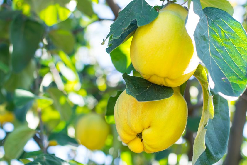 Den Flaum der Quitten abreiben, die Quitten waschen, vierteln und das Kerngehäuse entfernen.