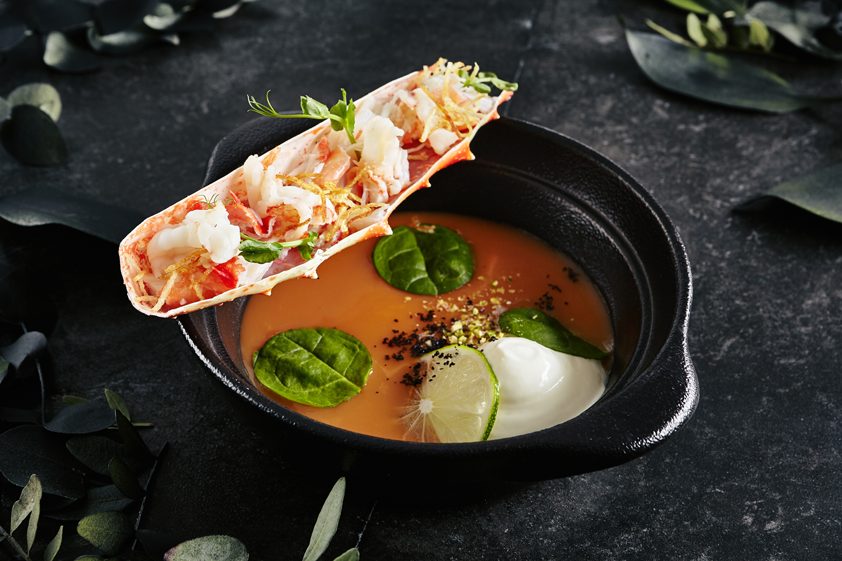 Geben Sie das vorbereitete Hummerfleisch zum Erwärmen für 5 Minuten bei schwacher Hitze in die Hummersauce, aber lassen Sie sie nicht kochen. Schlagen Sie die restliche Sahne steif und heben diese kurz vor dem Servieren mit 1 Teelöffel gehacktem Basilikum und 1 Teelöffel gehacktem Estragon unter die Sauce.