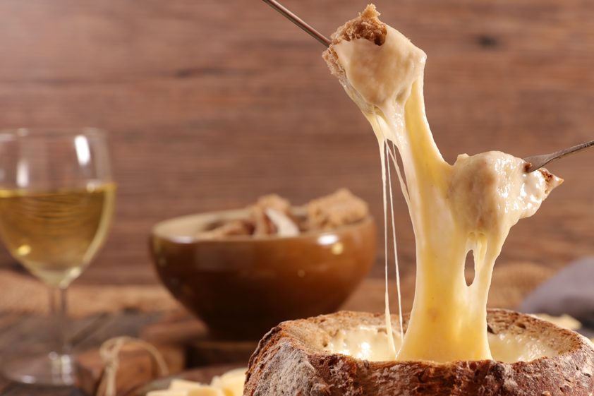Einen gusseisernen oder emaillierten Topf mit einer Hälfte der Knoblauchzehe ausreiben und den Weißwein hinzugeben. Den Topf auf dem Herd erhitzen, den Käse reiben und nach und nach, unter ständigem Rühren, in den Topf geben.