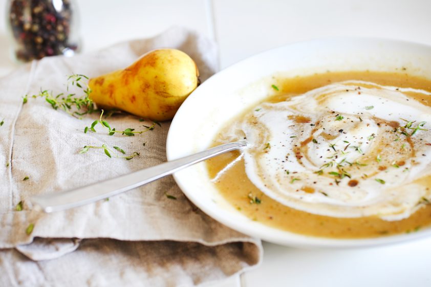 Die Schalotte schälen und würfeln. Den Knollensellerie zunächst schälen und grob würfeln, den Stangensellerie ebenfalls grob würfeln. Die Birne schälen, grob würfeln und zur Seite stellen. Dann die Schalotten-Würfel in Butter anschwitzen, die Sellerie dazugeben und ca. 4 Minuten mit anschwitzen. Mit Brühe und Sahne auffüllen und die Sellerie weichkochen, mit Salz und Pfeffer würzen. Wenn die Sellerie weich sind, die Birnenwürfel dazugeben noch einmal 2 bis 3 Minuten köcheln lassen. Im Anschluss mit einem Stabmixer fein passieren und warmhalten.