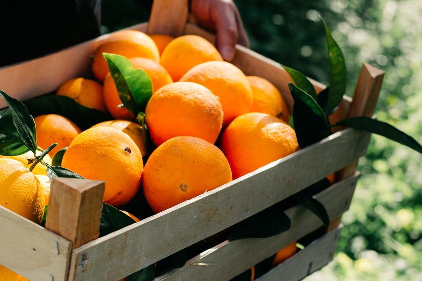 Die Orangen waschen und halbieren. Mit einem Gemüsemesser das Fruchtfleisch in einem Stück herauslösen und den Saft separat auffangen. Das gewonnene Fruchtfleisch in Würfel schneiden und alles getrennt voneinander zur Seite stellen.