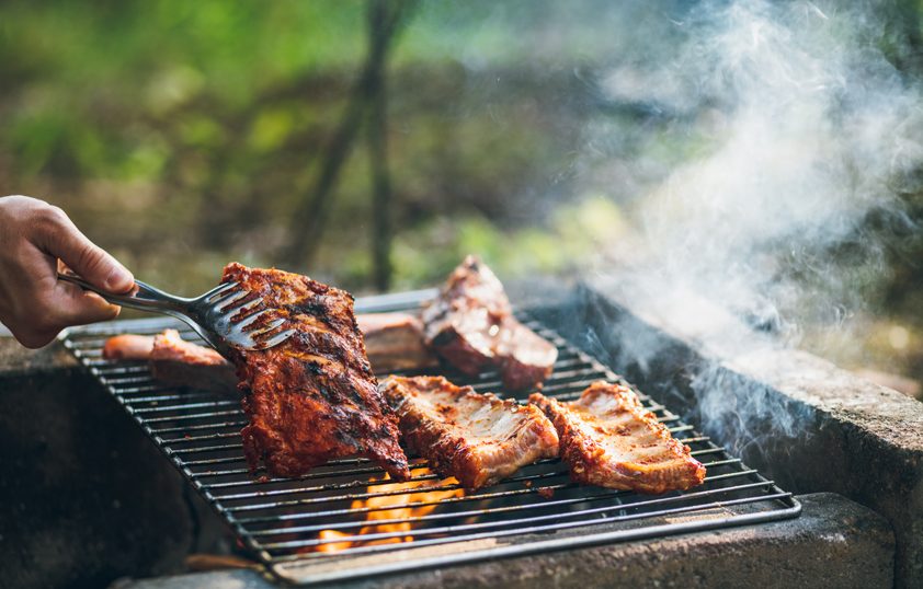 Die fertig geschmorten Spareribs werden dann mit der noch verbliebenen Marinade bepinselt und auf dem Grill noch einmal schön knusprig ausgebacken.