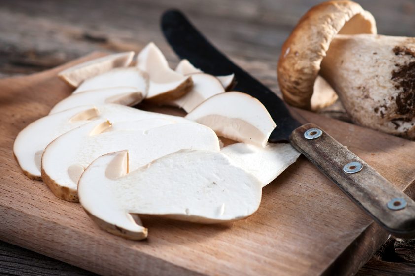 Putzen Sie die Steinpilze mit einem Pinsel oder etwas Küchenpapier, nicht waschen. Anschließend die Steinpilze in nicht zu feine Scheiben schneiden und in einer heißen Pfanne in Olivenöl anbraten. Schwenken Sie die Steinpilze gut durch damit sie schnell von allen Seiten Temperatur bekommen und somit weniger Feuchtigkeit verlieren. Geschieht das dennoch, gießen Sie die Flüssigkeit zwischendurch ab. Sobald die Steinpilze leicht gebräunt sind, nehmen Sie sie vom Herd.