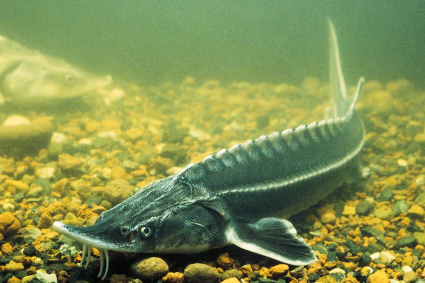 Den Stör einmal längs halbieren und jeden Strang einmal quer halbieren. Speck- oder Schinkenscheiben leicht überlappend nebeneinanderlegen, sodass jeweils ein Strang des Stör-Loins von der Länge hereinpasst. Die Loins einrollen bis sie wiederum leicht überlappend umwickelt sind. Die Röllchen bei mittlerer Hitze ringsherum goldbraun anbraten und auf ein Backblech mit Backpapier legen. Vor dem Servieren ca. 5 Minuten im vorgeheizten Backofen bei 150° C fertiggaren.