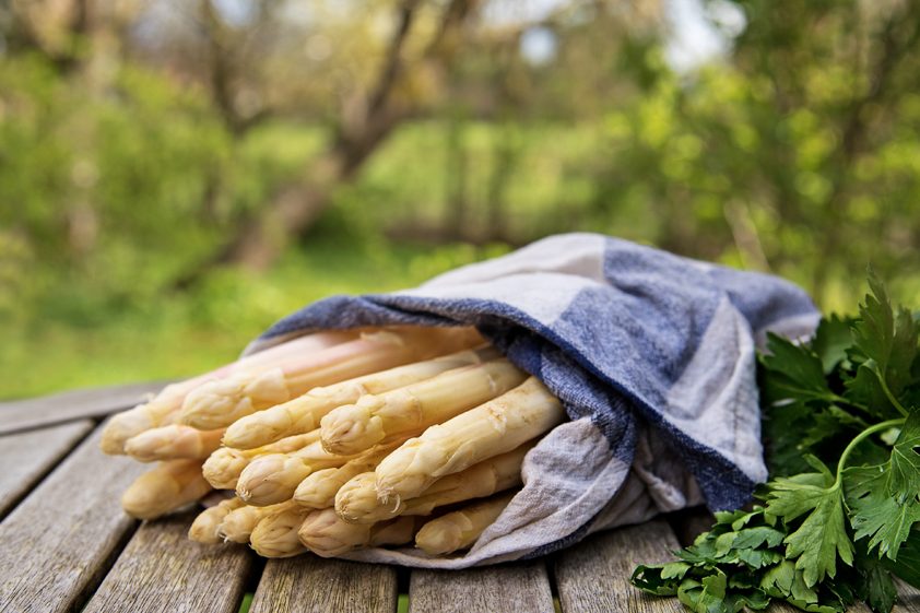 Den Spargel schälen und das untere, verholzte Ende abschneiden. Kurz zur Seite stellen.