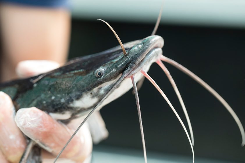 Jetzt die Welsfilets in gleichmäßige Nuggets schneiden.
