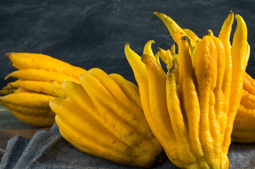 Die Buddhas Hand waschen und 1/3 davon mit einer gut geschärften Reibe, in feine Scheiben, über die sautierten Ravioli hobeln.